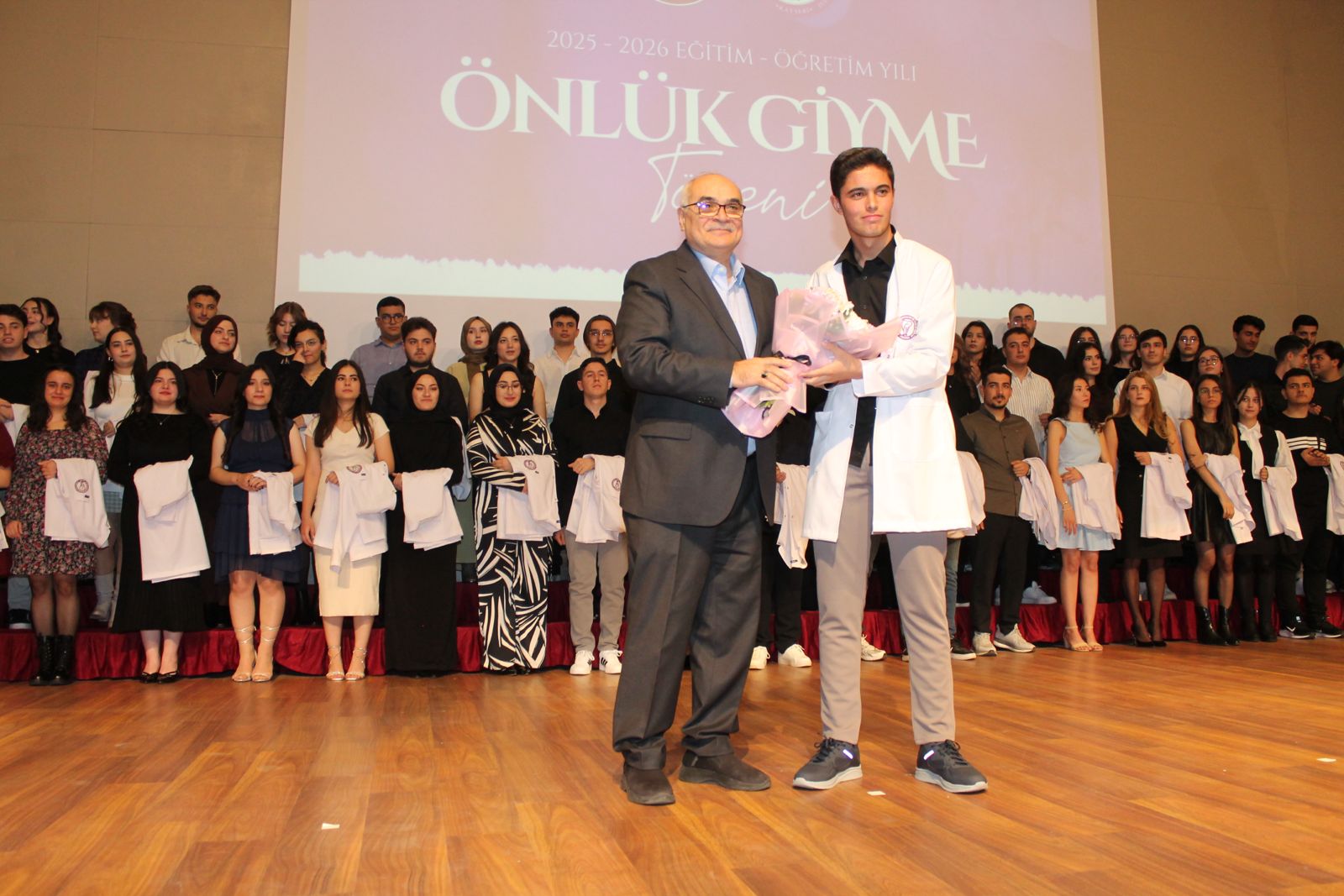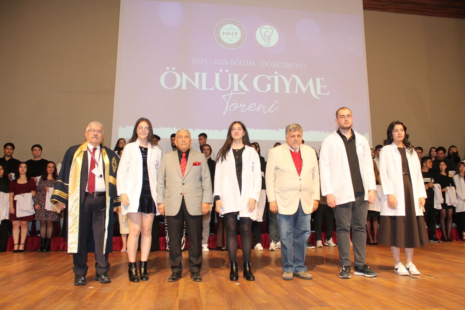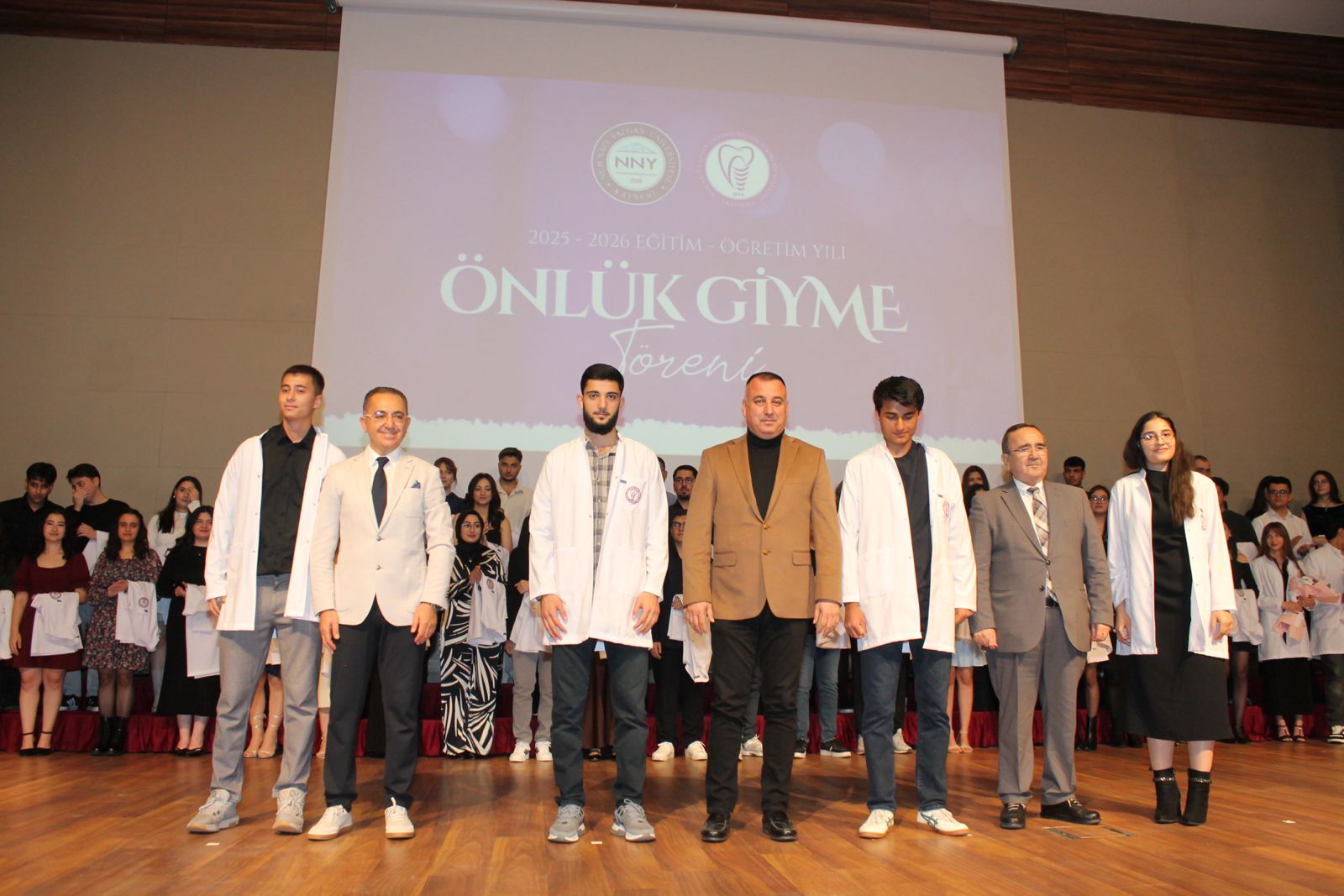 Konuşmaların ardından Rektörümüz Prof. Dr. Ahmet Fazıl ÖZSOYLU, Diş Hekimliği Fakültesi Dekanı Prof. Dr. Derviş YILMAZ ve TDB Kayseri Odası Başkanı Dt. İlhan KARACALAR; 2025-YKS sonuçlarına göre Üniversitemiz Diş Hekimliği Fakültesi’ni tercih eden ve en yüksek puanla yerleşen ilk üç öğrenciye önlüklerini giydirdi. Öğretim üyeleri tarafından tüm öğrencilere önlüklerinin giydirilmesinin ardından, Kayseri’nin tanınmış diş hekimlerinden Halit ERKİLETLİOĞLU tarafından öğrencilere yemin merasimi yaptırıldı. Tören, toplu fotoğraf çekimi ile sona erdi.